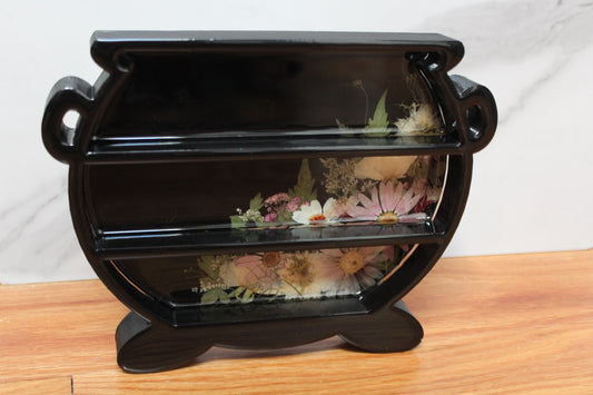 Cauldron Shaped Mini Shelf - Black with Pink & White Flowers